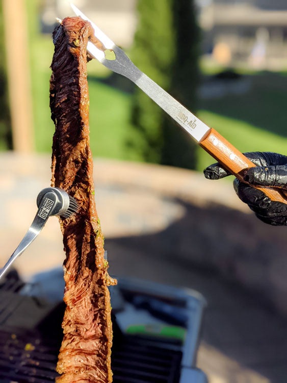 - Heat grill to at least 400° F. Grill steak over direct heat. Skirt steak is thinner and will only take a few minutes to cook on each side. Flank steak is thicker and may take slightly longer. Use the BBQ-AID Fork or BBQ-AID Tongs to flip the steak and cook to desired doneness.